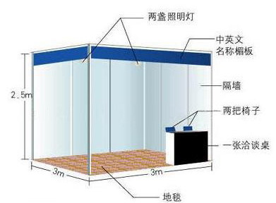 展位示意图 / Booth diagram ■标准展位费用包括:展出场地、2.5m高壁板、楣牌制作、9平方米地毯、洽谈桌一张、椅子二把、10A/220V单相插座一个,射灯二支。 ■空场地不带任何展架及设施,参展商可自行安排特殊装修工作或委托组织单位推荐的搭建公司。标准展台示意图:特装展台示意图: